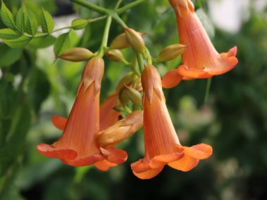 Hybrido fra Campsis grandiflora e Campsis radicans. Campsis x tagliabuana Madame Gallen (select) è un miglioramento della varietà Madame Gallen, per una maggiore vigorosità della specie radicans e per una migliore fioritura della specie grandiflora. Uno dei migliori rampicanti a foglia caduca per il vostro giardino. I rami hanno radici aeree che aderiscono ai muri o a qualsiasi sostegno. In breve tempo può coprire vaste superfici. Da giugno a settembre caratteristici fiori a forma di trombetta di colore rosso-arancio coprono totalmente i rami. Esposizione: pieno sole o mezz’ombra, anche se in pieno sole la fioritura sarà sicuramente maggiore. D’ottima rusticità. Potare in febbraio marzo solo se necessita. Nessuna esigenza in fatto di terreno. Non richiede cure particolari. Altezza massima da 6,00/8,00 metri. Temperature minime -25° C.