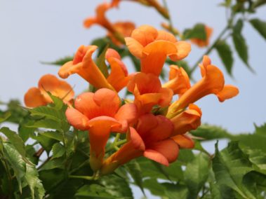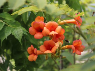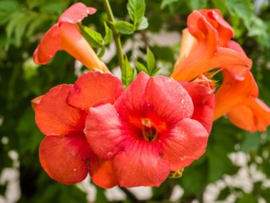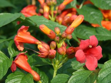 Hybride entre Campsis grandiflora et Campsis radicans. Plante grimpante, à feuilles caduques, qui adhère spontanément au mur. Les fleurs sont en forme de trompettes vivement colorées. La floraison, très abondante et spectaculaire, offre de nombreuses fleurs en forme de trompette de couleur rouge-orangé de juillet à septembre. La variété ‘Madame Galen ‘(select) est tout particulièrement conseillée pour sa magnifique floraison. Cette plante illumine les murs et clôtures de ses couleurs flamboyantes. Utilisation: parfaite pour garnir murs, treillages et clôtures. Plantes parfaitement rustiques mais préfèrent les situations ensoleillées pour bien fleurir. Hauteur maximale: 6,00/8,00 m. Taille de formation si nécessaire. Température minimale de -25°C.