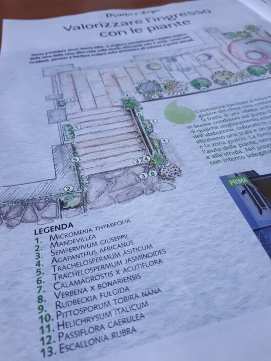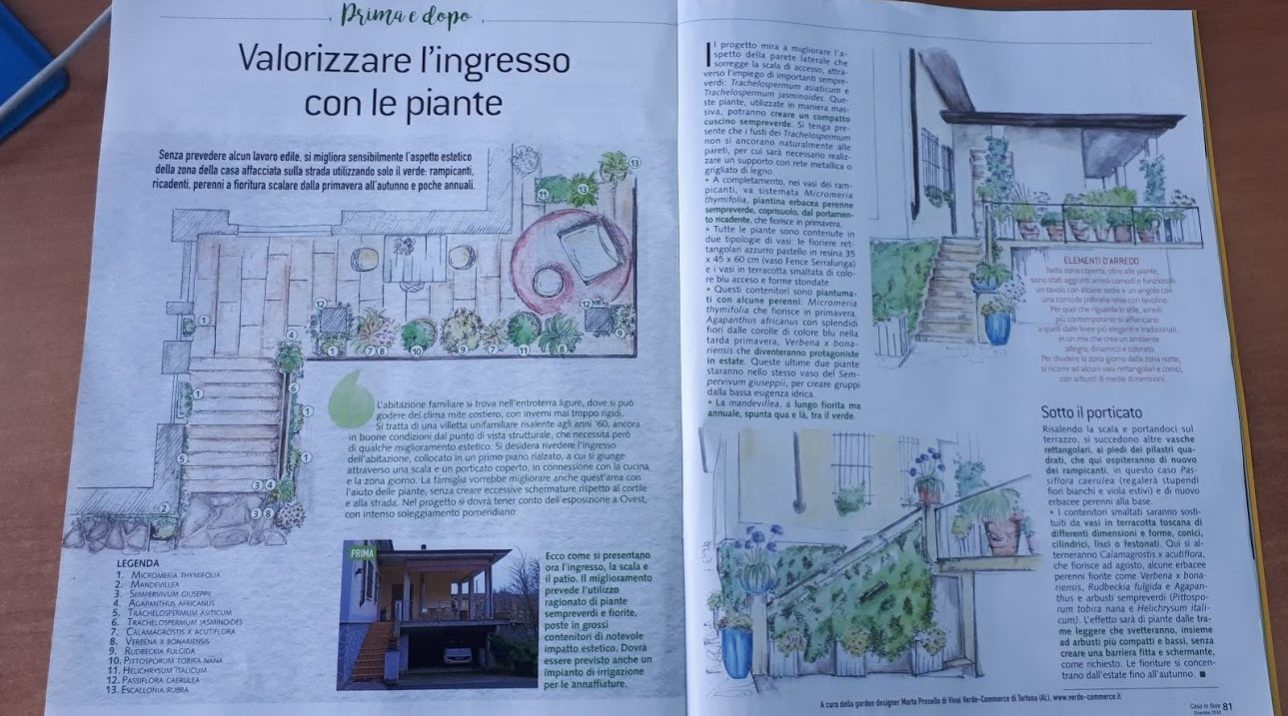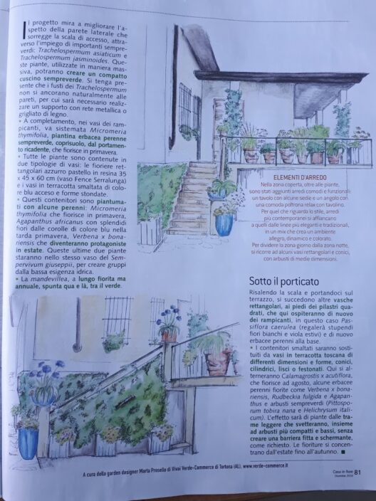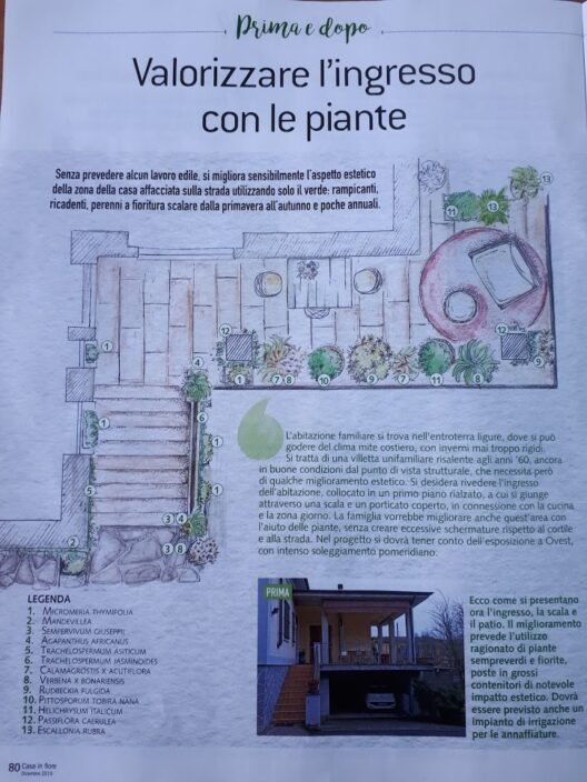 Nella rubrica di questo mese rivediamo l’ingresso di una villetta unifamiliare collocato in un primo piano rialzato, a cui si giunge attraverso una scala e un porticato coperto. La famiglia vorrebbe migliorare anche quest’area con l’aiuto delle piante, senza creare eccessive schermature rispetto al cortile e alla strada. Nel progetto si è tenuto conto dell’esposizione a Ovest, con intenso soleggiamento pomeridiano.