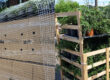 Sopra la balaustra in muratura sono appoggiate e tenute ben ferme da portavasi in tondino di ferro, quattro cassette lunghe 60 cm, larghe 30 e alte 25 accoppiate a due a due in modo da creare un po’ di privacy senza togliere la vista sul giardino condominiale a chi è seduto al tavolo. Nelle cassette si alternano una pianta sempreverde e una spogliante allo scopo di avere in qualunque stagione dell’anno foglie e/o fiori da osservare anche stando dentro casa.