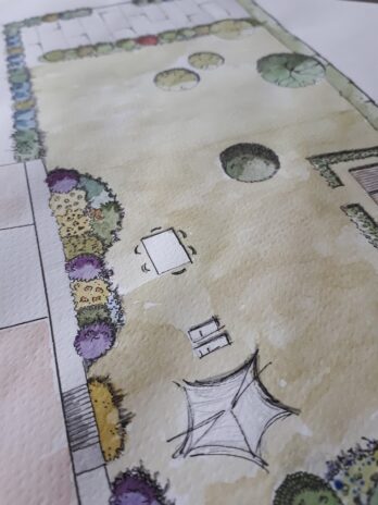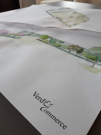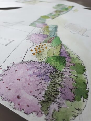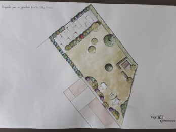 Progetto eseguito a matita ed acquerello di un giardino fiorito e colorato tutto l’anno.