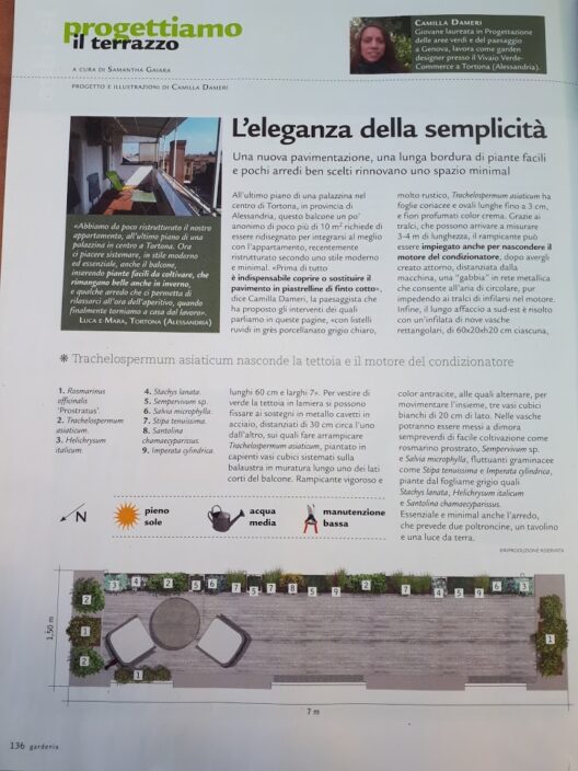 Per vestire di verde la tettoia in lamiera si possono fissare ai sostegni in metallo cavetti in acciaio, distanziati di 30 cm circa l’uno dall’altro, sui quali far arrampicare Trachelospermum asiaticum, piantumato in vasi cubici e posizionati sulla balaustra in muratura lungo uno dei due lati corti del balcone.