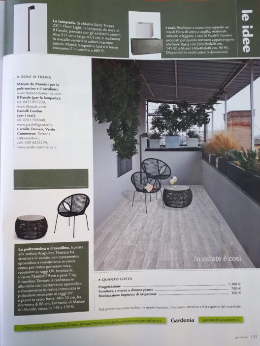 Infine, il lungo affaccio a sud-est è risolto con un’infilata di nove vasche rettangolari color antracite, alle quali alternare, per movimentare l’insieme, tre vasi cubici bianchi.