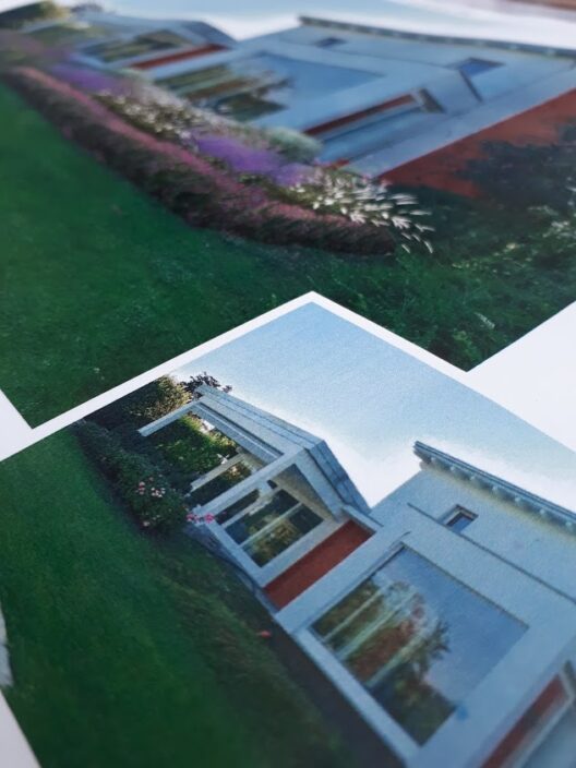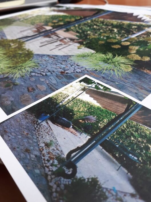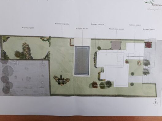 Fotomontaggi e planimetria che mostrano la risistemazione di un giardino privato che fa da contorno ad un’abitazione moderna. L’intento dei proprietari è quello di far dialogare gli ambienti interni con quelli esterni e di concepire il giardino come un’ulteriore stanza della casa. Abbiamo pensato ad un contrasto tra siepi sempreverdi formali ed essenze perenni per dare colore durante tutte le stagioni.