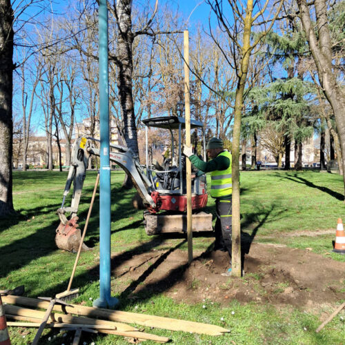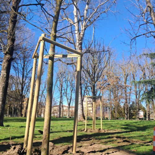 A seguire, si procederà con l’installazione dei sistemi di tutoraggio, costituiti da tre pali di pino di sostegno opportunamente dimensionati e fissati (i tutor svolgono così un ruolo essenziale nelle prime fasi di post-impianto, garantendo stabilità meccanica alla pianta e proteggendola dalle sollecitazioni causate dal vento o fattori esterni).