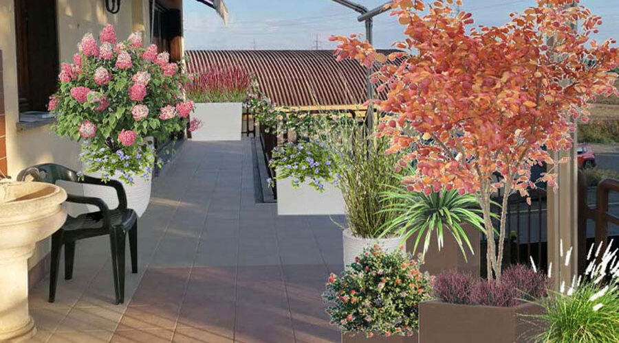 Quella che segue è la progettazione di un terrazzo autunnale realizzata nel mese di novembre. Tra le piante messe a dimora: